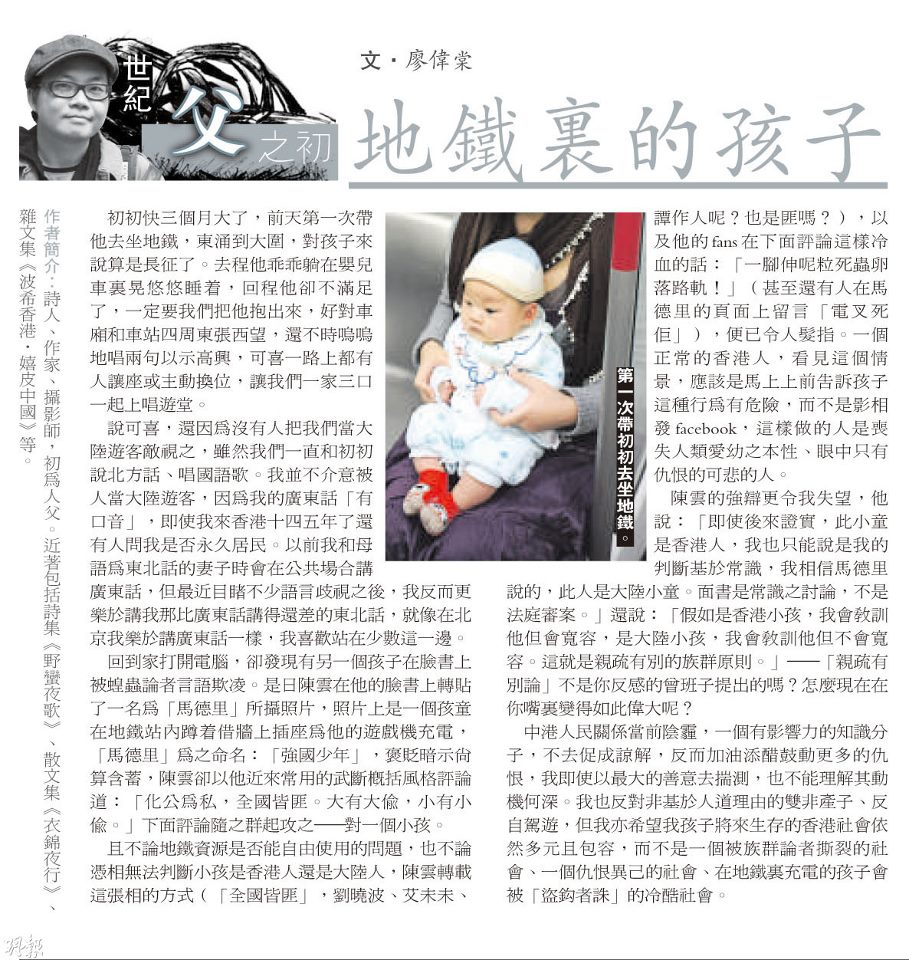 說可喜,還因為沒有人把我們當大陸遊客敵視之,雖然我們一直和初初說北方話、唱國語歌。我並不介意被人當大陸遊客,因為我的廣東話「有口音」,即使我來香港十四五年了還有人問我是否永久居民。以前我和母語為東北話的妻子時會在公共場合講廣東話,但最近目睹不少語言歧視之後,我反而更樂於講我那比廣東話講得還差的東北話,就像在北京我樂於講廣東話一樣,我喜歡站在少數這一邊。