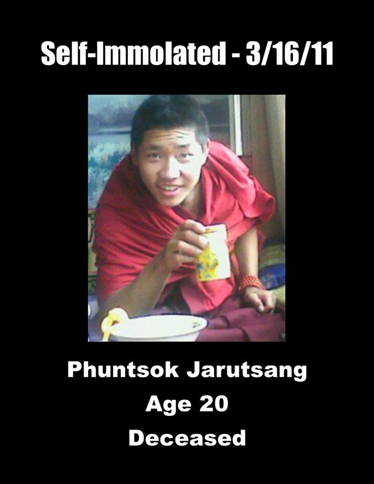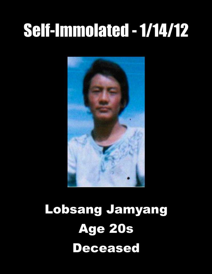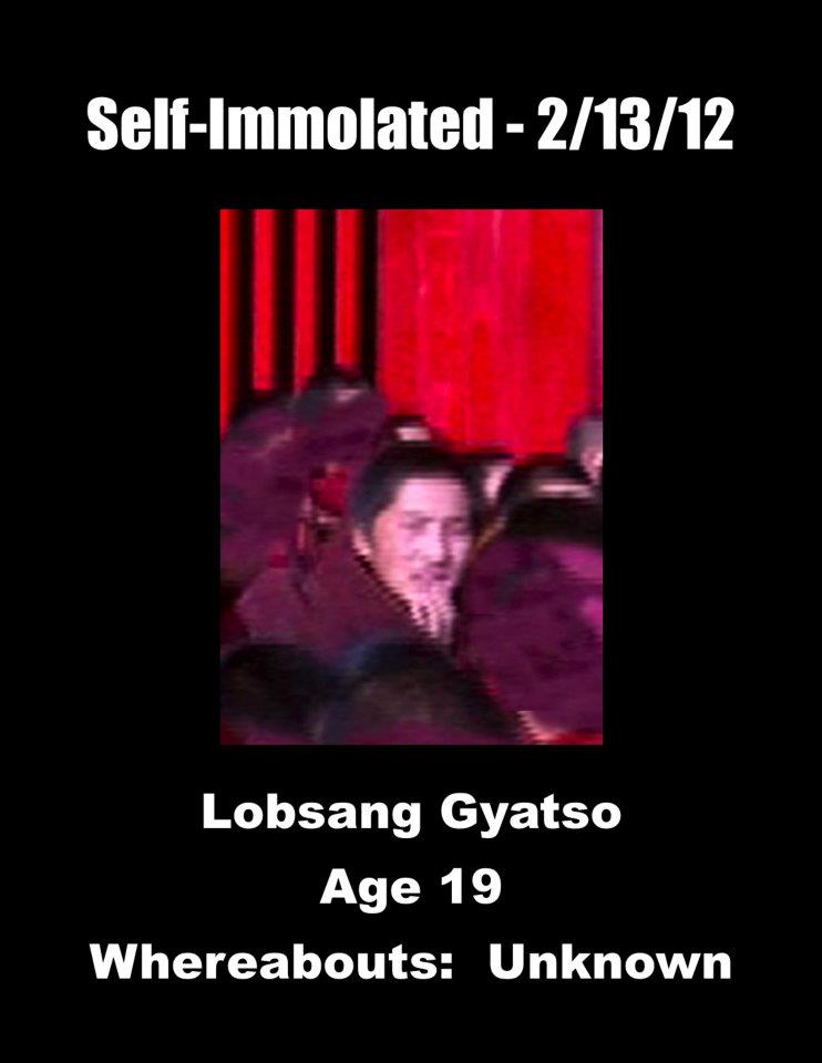 21、洛桑嘉措:安多阿坝(今四川省阿坝藏族羌族自治州阿坝县)格尔登寺僧人,19岁。于2012年2月13日下午约两点半,在阿坝县城的大街上点火自焚。军警扑灭了火,殴打了他,带走了他。也毒打了在现场的两名藏人青年,并带走了他俩。洛桑嘉措目前的状况和下落不明。