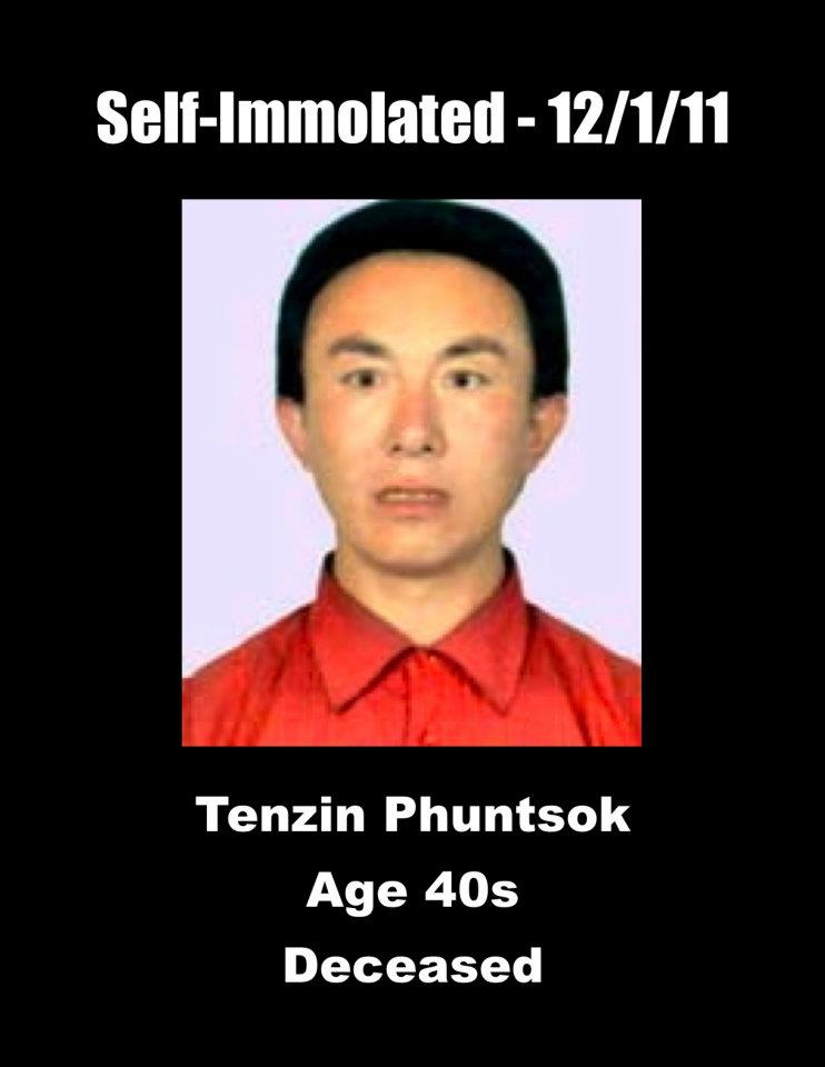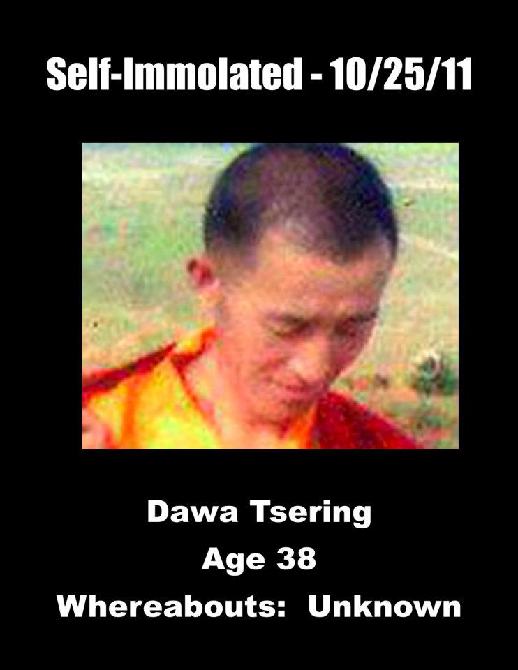 11、达瓦次仁:康甘孜(今四川省甘孜藏族自治州甘孜县)甘孜寺僧人,38岁。于2011年10月25日在甘孜寺举办金刚法舞法会时点火自焚,呼喊“让达赖喇嘛返回西藏”、“西藏没有人权”。被藏人僧俗扑灭了火并送医院抢救,后又送回寺院,伤势严重,目前情况不明。