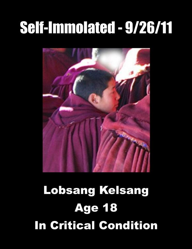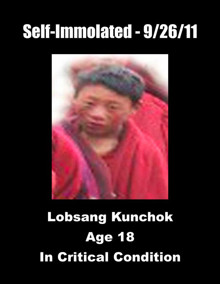 5、洛桑贡确:安多阿坝(今四川省阿坝藏族羌族自治州阿坝县)格尔登寺僧人,18岁。于2011年9月26日在阿坝县城点火自焚,呼喊“祈愿达赖喇嘛长久住世”、“我们要宗教信仰自由”,烧成重伤,被中共军警带走,目前下落不明,生死不明。