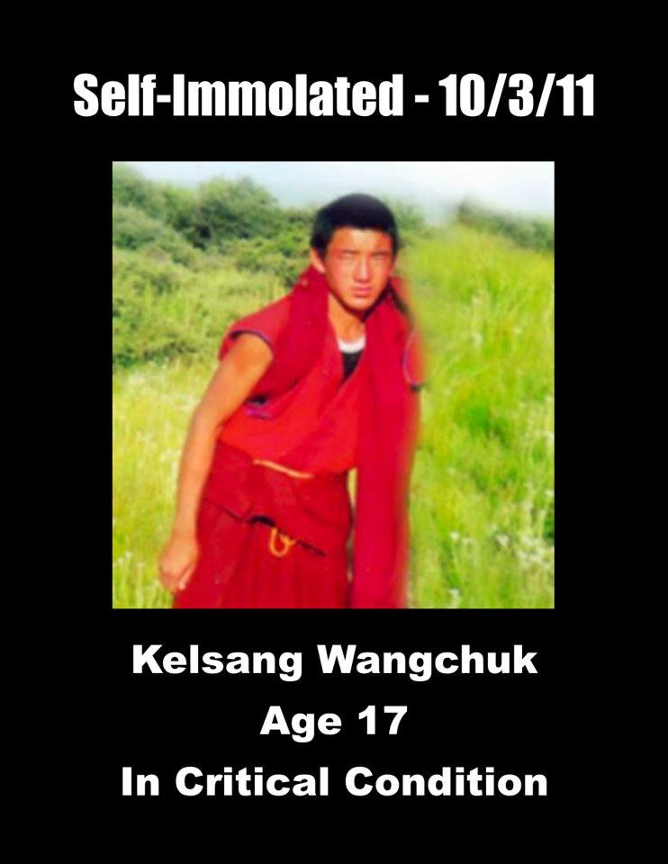 6、格桑旺久:安多阿坝(今四川省阿坝藏族羌族自治州阿坝县)格尔登寺僧人,17岁。于2011年10月3日在阿坝县城点火自焚,并高举尊者达赖喇嘛法像,呼喊“西藏需要宗教自由”等,烧成重伤,被中共军警带走,目前下落不明,生死不明。