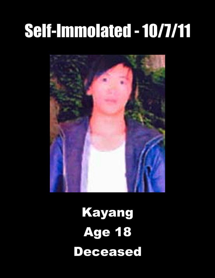 8、卡央:安多阿坝(今四川省阿坝藏族羌族自治州阿坝县)上塔瓦村牧民,18岁。于2011年10月7日在阿坝县城点火自焚,双手合十,高呼口号,遭中共军警毒打,次日牺牲。他本是格尔登寺僧人,2010年被工作组驱逐出寺。而他的爷爷扎西在2008年被军警枪杀。