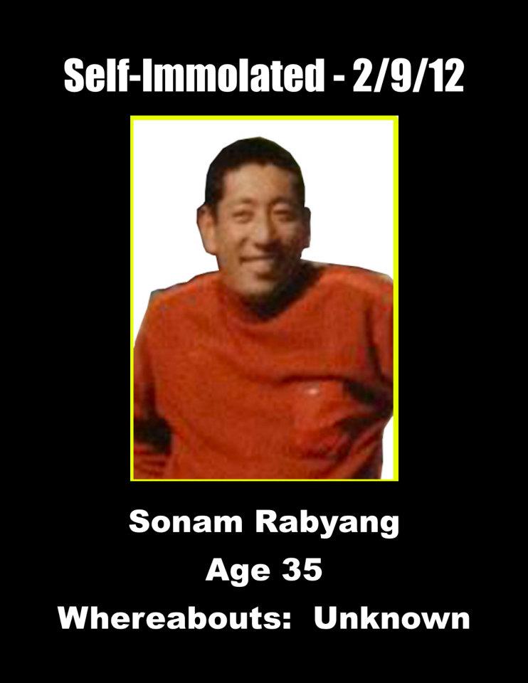 18、索南热央:康称多(今青海省玉树藏族自治州称多县)拉布寺僧人,37岁。于2012年2月8日中午在称多县境内点火自焚,烧成重伤,被中共军警带走,目前下落不明,生死不明。