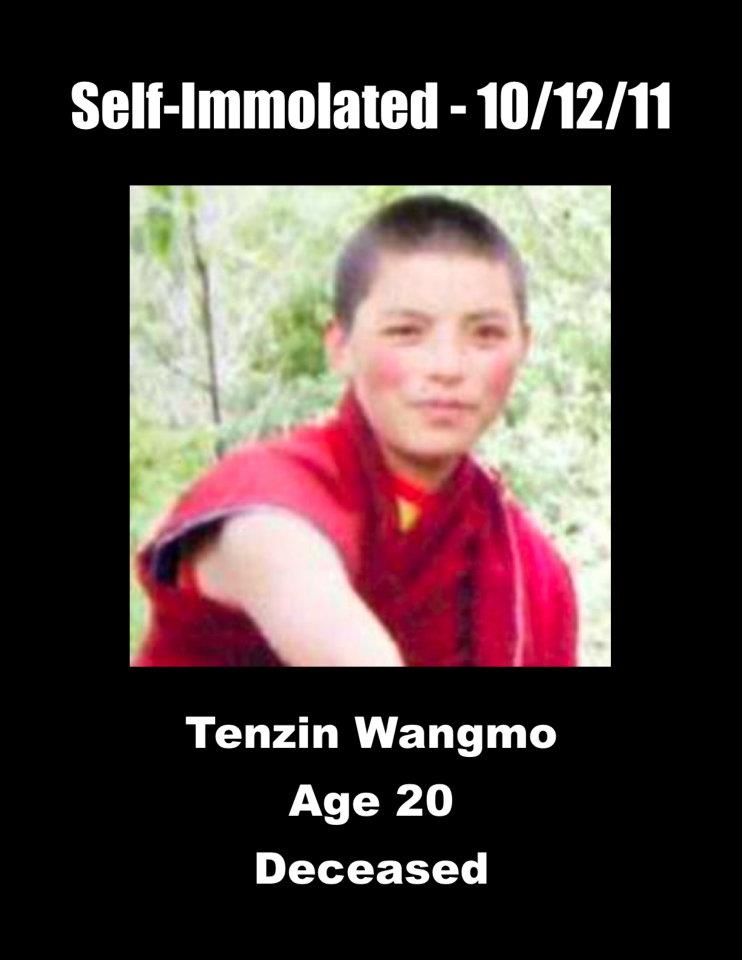 10、丹增旺姆:安多阿坝(今四川省阿坝藏族羌族自治州阿坝县)玛米觉姆贡巴(即四洼尼姑寺)尼师,20岁。于2011年10月17日在寺院附近点火自焚,呼喊“让达赖喇嘛回到西藏”、“西藏自由”,当场牺牲。她是境内藏人自焚中的第一位女性。