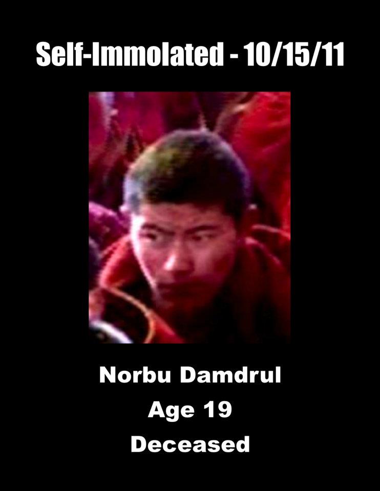 9、诺布占堆:安多阿坝(今四川省阿坝藏族羌族自治州阿坝县)索尼(音译)村牧民,19岁。于2011年10月15日在阿坝县城点火自焚,并呼喊“西藏要自由”、“西藏独立”、“让达赖喇嘛返回西藏”。烧成重伤,被中共军警带走。于2012年1月5日在马尔康县医院去世。他本是格尔登寺僧人,2010年被工作组驱逐出寺。