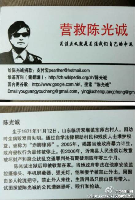 另据南京网友珍珠微博消息:今天下午14:30分,她们已经抵达临沂人民广场,约15:30分正在临沂人民广场向游人发放1000张声援陈光诚的“光诚卡”。