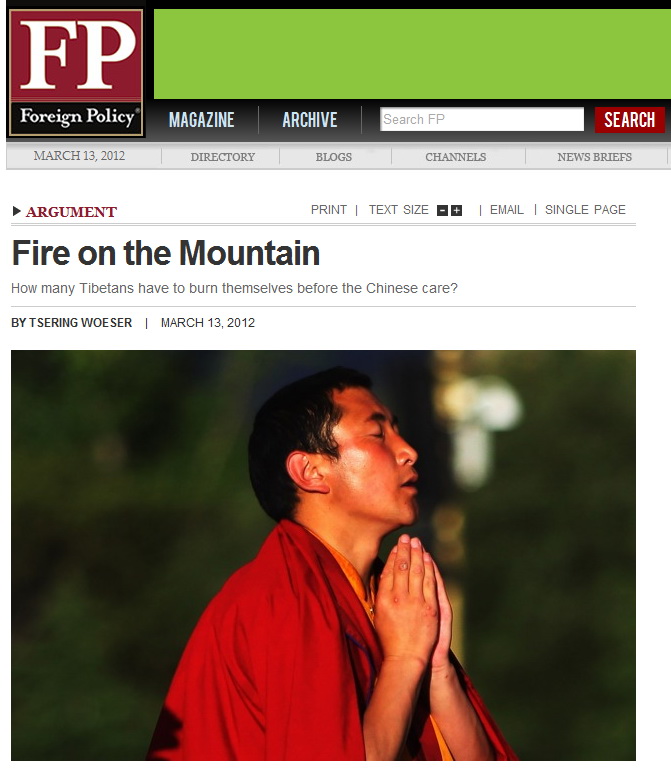 这是我的文章发表于美国外交政策(Foreign Policy)2012年3月13日之网络截图 http://www.foreignpolicy.com/articles/2012/03/13/tibet_self_immolation?page=0,0