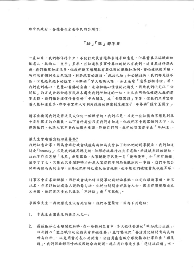 對於政客的演技、「政治化妝」和公關伎倆,我們亦見怪不怪。但見愈來愈多的謊言,不斷「擘大眼講大話」,加上什麼「選票影相作證」等,我們感到痛心,更憂心香港的自由、法治和核心價值從此消失,因此我們決定以「公開信」的方式,告訴全港市民及各選委我們所知道的一切,並且表明兩位候選人我們都不支持。我們預計這信件會引發「中央關注」 或「西環震怒」等等,但我們只希望香港人能知道更多,亦不希望有人可利用政府的保密制度鑽空子,不停的「謊言蓋謊言」。