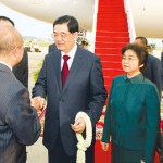 3月30日,国家主席胡锦涛乘专机抵达金边国际机场,开始对柬埔寨进行国事访问。这是胡锦涛主席和夫人刘永清在机场受到柬埔寨国王代表拉那烈亲王和柬埔寨副首相贡桑奥等热情迎接。新华社记者黄敬文摄