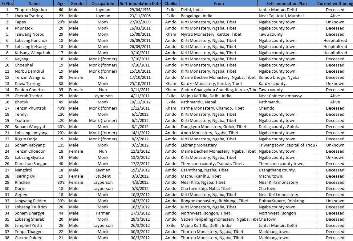 图1、为38位自焚的境内、境外藏人的简历表,其中包括1998年自焚牺牲的流亡藏人Thupten Ngodup(图登欧珠)、2006年自焚受伤的流亡藏人Lhakpa Tsering(拉巴茨仁)。