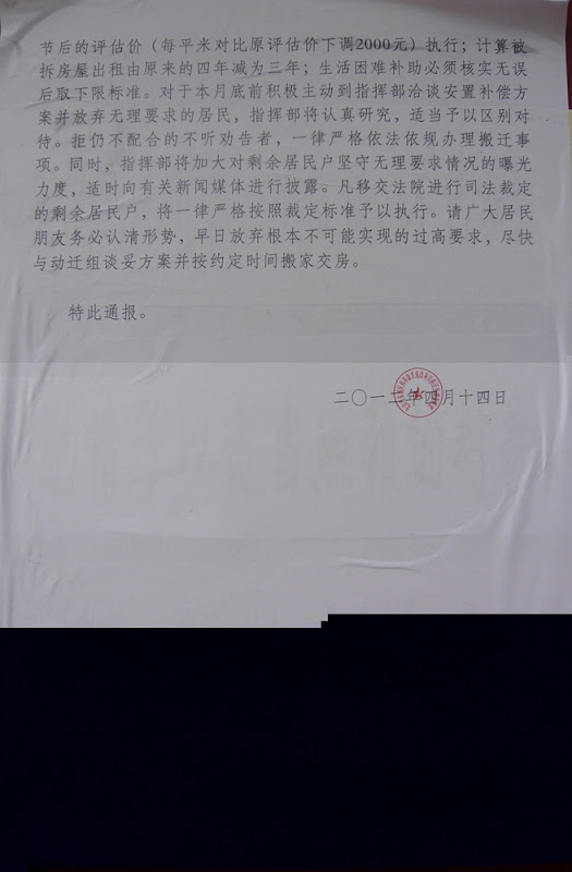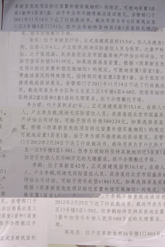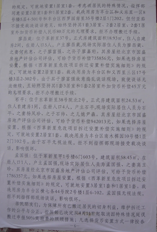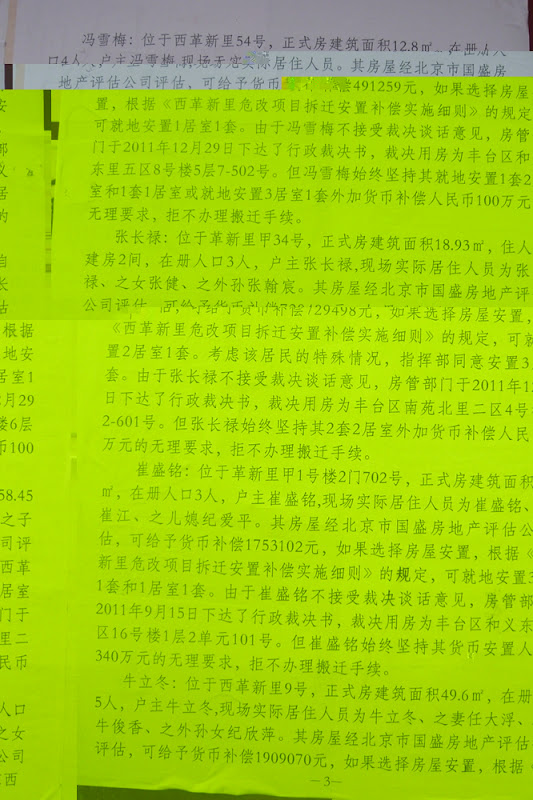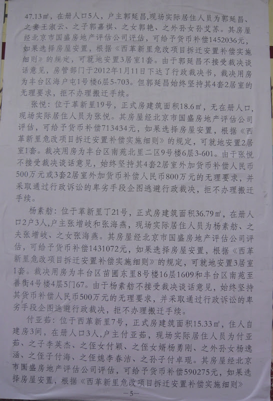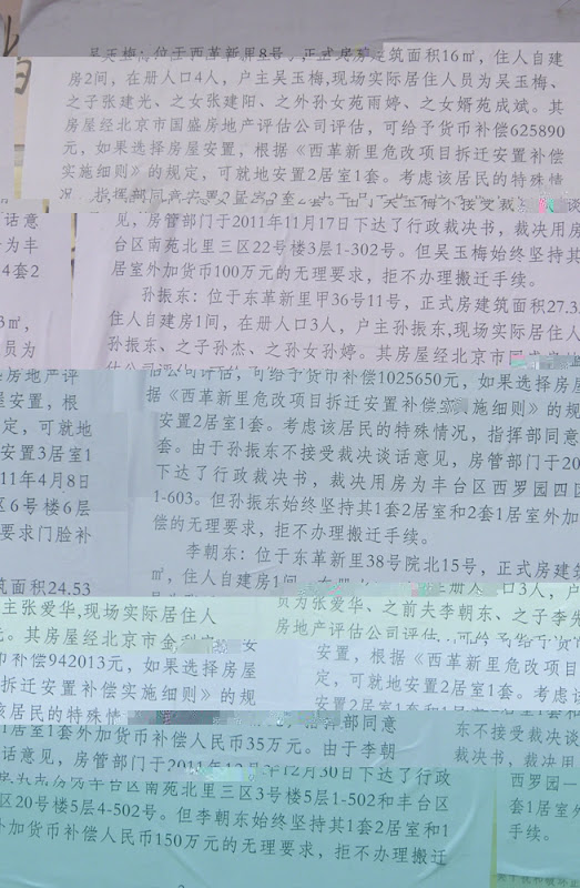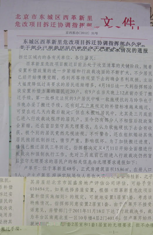 (维权网信息员张宁宁报道)4月14日,北京市东城区西革新里危改项目拆迁协调指挥部超越职权,在拆迁地区的醒目位置张贴告示,羞辱张悦等拆迁户。该告示夸大事实,泄露多名拆迁户的隐私,造成了严重的负面影响。该拆迁指挥部张贴告示的真正原因是,张悦抢在行政裁决前向法院提起行政诉讼,导致房管局无法作出裁决,更使该拆迁指挥部恼羞成怒,故贴出长达7页的告示,羞辱其眼中的“钉子户”。对此,该指挥部还不过瘾,雇佣外来人员,开着一辆无牌车,车顶上安装二个高音喇叭,并标称为“综合执法”,不分昼夜一遍又一遍地宣读“告示”,穿街走巷。这不仅影响附近居民休息,还给未签订拆迁安置协议的拆迁户造成莫大的精神压力。