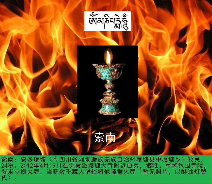 昨天,4月19日下午,在安多壤塘(今四川省阿坝藏族羌族自治州壤塘县中壤塘乡),两位藏人牧民曲帕嘉(Choephag Kyab)和索南(Sonam),分别为25岁和24岁,以自焚表达决绝的抗议。据自由亚洲藏语节目等媒体报道,两位自焚藏人已牺牲。而当地壤塘大寺为他们举行了超度法会,当局派军警包围壤塘大寺,要求立即火葬,当晚数千僧人与民众为两位自焚藏人举行了火葬仪式。因为暂时没有他们的照片,故在此帖以酥油供灯替代。