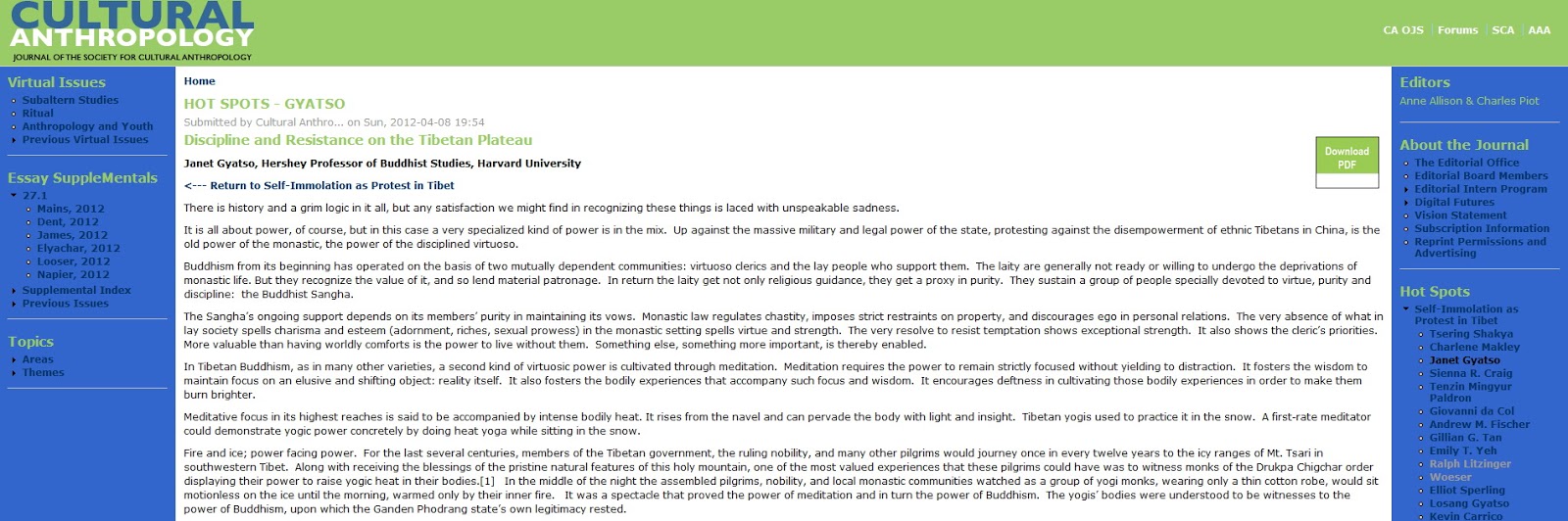Traditionally, ascetic practice targeted an inner enemy: selfish clinging, vanity, enmity. Today the target of Tibet’s recent self-immolations is an outer enemy: an intrusive, repressive, unsympathetic state. Differently from the old pattern, this outer foe is compelled to witness the display of yogic power, the power to withstand the pain of fire, the power to face down death or torture. But this is not a witnessing that bolsters the power of the state. It is a forced witnessing of a spectacle that aspires to delegitimize the state. It is a spectacle that purports to demonstrate with deadly precision where real power still resides: in the vision and skill of the virtuoso who masters his own destiny.