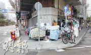 | 有深水埗露宿者旅居空置公寓騎樓底,各人「家當」全放這兒。(李澤彤攝) |