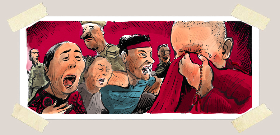 最近几年,图伯特(西藏)人权活动人士中的自焚事件逐年上升,《时代》杂志将这些事件称为“2011年度排名第一的未获充分报道的事件”。在印度新德里,漫画作者丹•卡里诺(Dan Carino)采访了印度人权活动人士Shibayan Raha,他在2007年曾因试图自焚抗议中国囚禁达赖喇嘛认定的第十一世班禅喇嘛而遭捕。作者还走访了马努卡迪拉(Majnu Ka Tilla)流亡博巴定居点,试图了解众多博巴决心为了他们故乡而献身的原因。