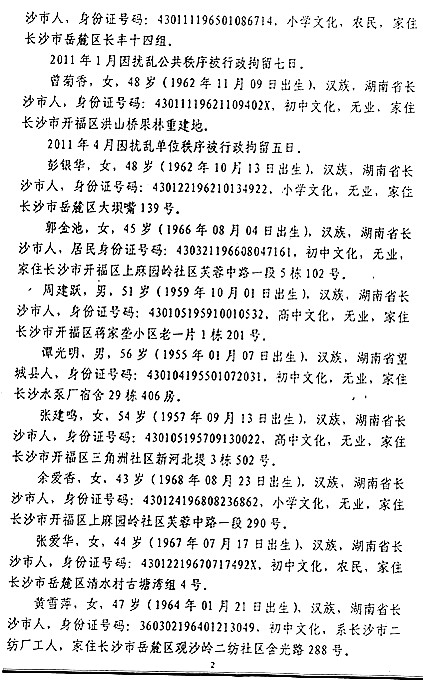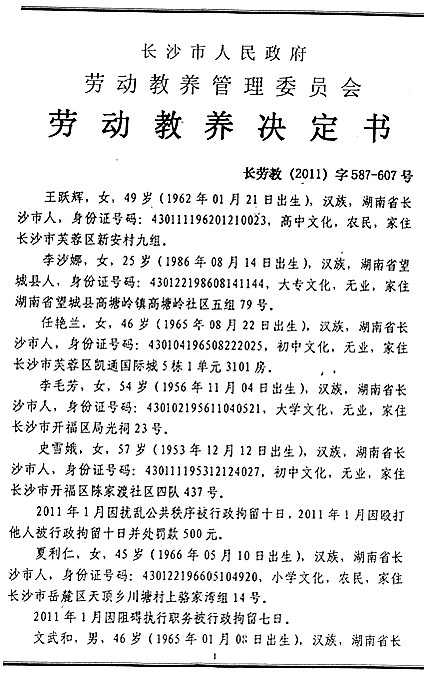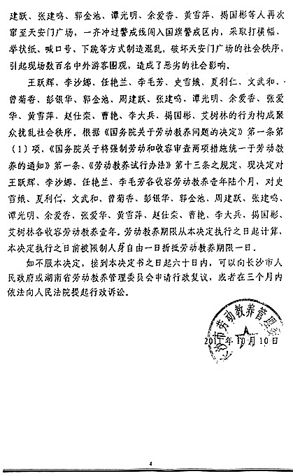 然而,当上访者回家后,长沙市公安局以扰乱社会秩序罪,把21人从长沙市五区内抓捕,2011年11月以扰乱社会秩序罪同时被长沙市劳动教养委员会裁定劳动教养,2年、1年6个月、1年,有4人逮捕至今未判。