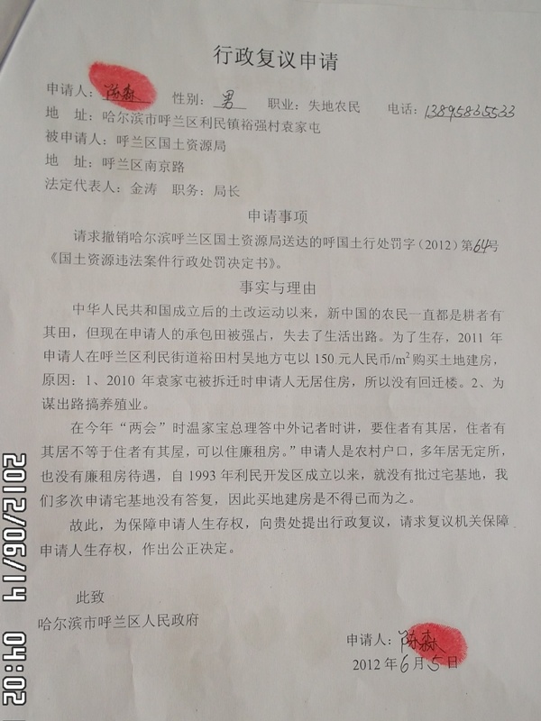 因陶恒对《呼国土行处罚字(2012)第65号国土资源违法案件行政处罚决定书》、李君对《呼国土行处罚字(2012)第66号 国土资源违法案件行政处罚决定书》、陶建国对《呼国土行处罚字(2012)第63号国土资源违法案件行政处罚决定书》、陈森对《呼国土行处罚字(2012)第64号国土资源违法案件行政处罚决定书》不服,按照决定书“……60日内,向哈尔滨市国土资源局或呼兰区人民政府申请行政复议或在15日内向呼兰区人民法院提起行政诉讼”的要求。四人于6月3日向呼兰区人民政府递交了行政复议申请、身份证复印件、处罚决定书复印件、土地转包协议书复印件,但呼兰区政府工作人员拒收,四人只好于6月7日通过快递的方式邮递了上述材料。结果收到政府如此不负责任的回复。