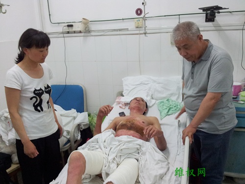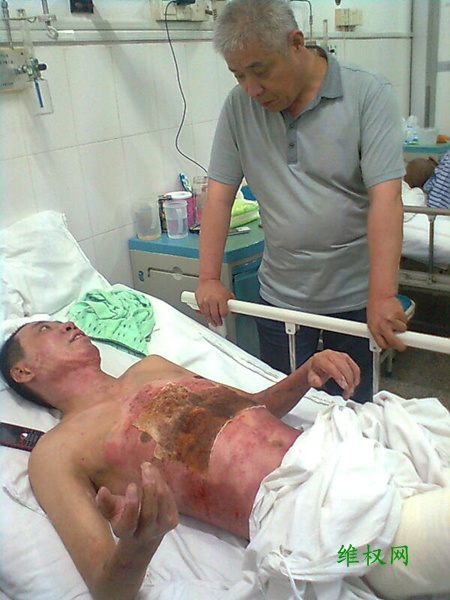 (维权网信息员张宁宁报道)6月15日晚,倪文华与南通、无锡维权人士一同到南通第一人民医院,看望因抗圈地而自焚的缪强。情景惨不忍睹。缪强正在植皮治疗,两手僵硬,难以翻身,痛苦不堪。