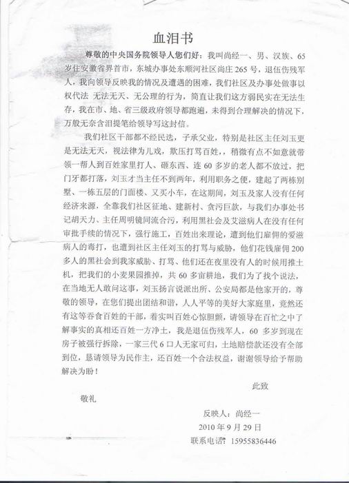 尚经一老人是伤残退伍军人,为了公平正义,为了反腐败,与一些村民联名举报刘政华、刘玉二人的腐败行为,为此多次赴北京上访,孰料,不仅未见任何效果(仅刘政华被检察院侦察,开除党籍,人大代表资格除名),可新的土地征收又即将开始,这让他和村民情何以堪?
