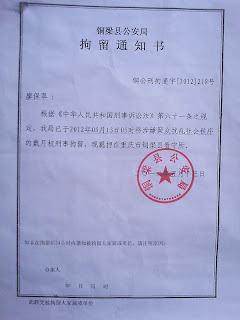 访民戴月权被抓捕押送回重庆市铜梁县后,铜梁县公安局于5月13日给其家属送达一份拘留通知书,告知戴月权涉嫌聚众扰乱社会秩序刑事拘留,被羁押铜梁县看守所。