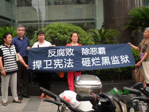大家在上海市高级法院门口高喊口号:“我要立案,捍卫法律,还我诉权”。 并且拉出横幅:“腐败,动摇国家的根基,拨乱反正,刻不容缓。”