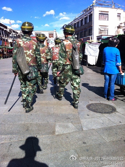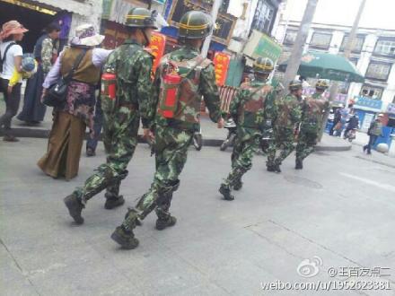 出现在拉萨老城的一个特别的景观是,满街巡逻的军警都背上了红色灭火器。这与5月27日,两位藏人在大昭寺与八廓街派出所之间自焚有关。事实上,在2009年阿坝僧人扎白自焚之后,驻扎藏地的军警就已经配备了灭火器。随着全藏地自焚人数的上升,五人一组的巡逻军警中,甚至两人背着灭火器。