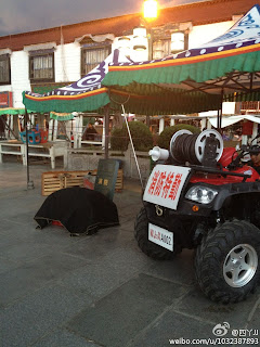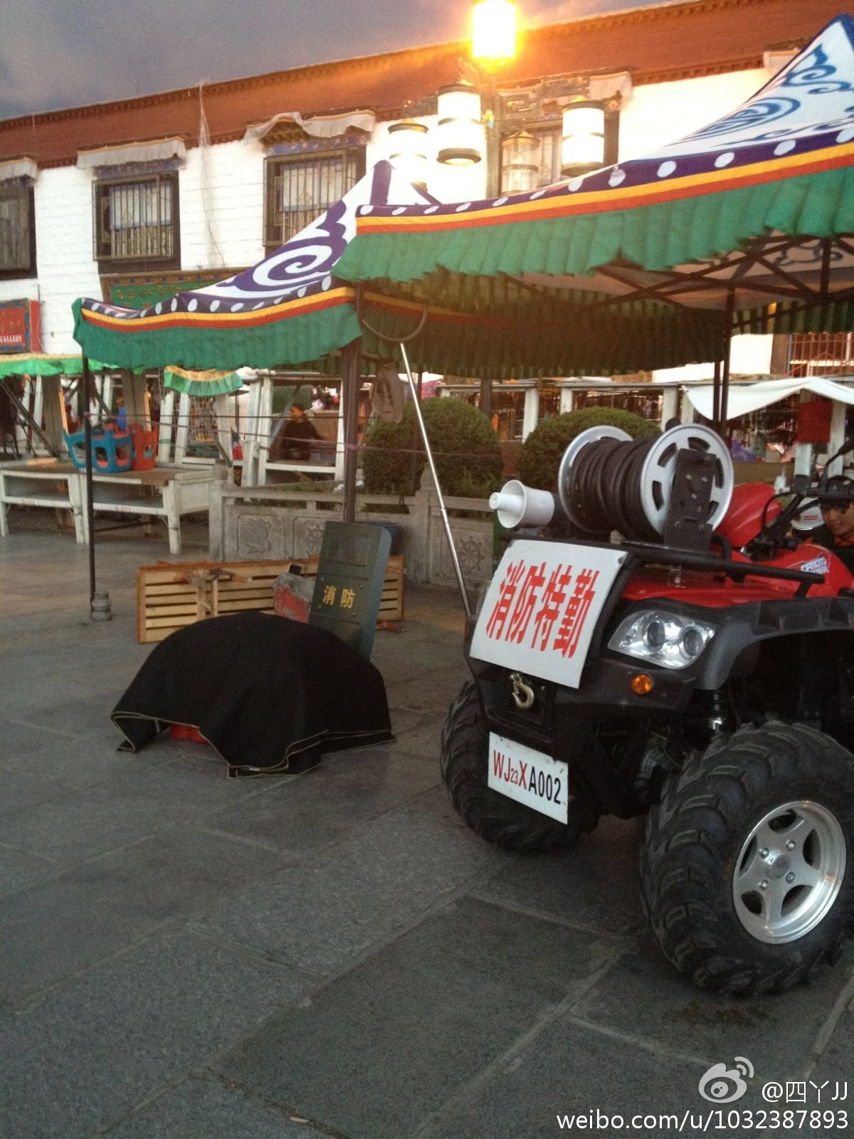 | 以上图片来自新浪微博,拍摄者是旅游者,地点是拉萨老城。图3被黑布罩着的是红色灭火器,隐约可见。 |