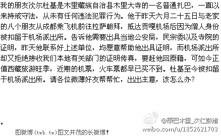 这张图片的内容是:“我的朋友次尔杜基是木里藏族自治县木里大寺的一名普通扎巴(注:普通僧人),一直以来持戒守法,从未有任何违法犯罪行为。他于昨天六月二十五日与老家的八个朋友从成都乘飞机前往拉萨朝拜,抵达贡嘎机场后因为僧人身份被扣留于机场派出所。告诉他需要出具当地公安局,民宗委以及寺院的证明,昨天他联系好上述单位,均愿意帮助他出具证明,而机场派出所却又拒绝接收我们本地有关部门的证明传真,要赶他回原籍,可如今正值西藏旅游旺季,近期的机票,火车票都早已买不到。杜基至今被扣留于机场派出所。请各位微博好友帮帮忙,出出主意,该怎么办?”