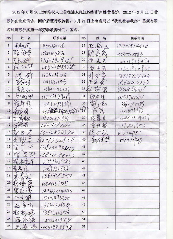 2012年3月9日,黄苏沪正常去北京上访,回到上海后却被驻地六里派出所关进张江拘留所,以莫须有的“扰乱社会秩序”罪劳教一年。