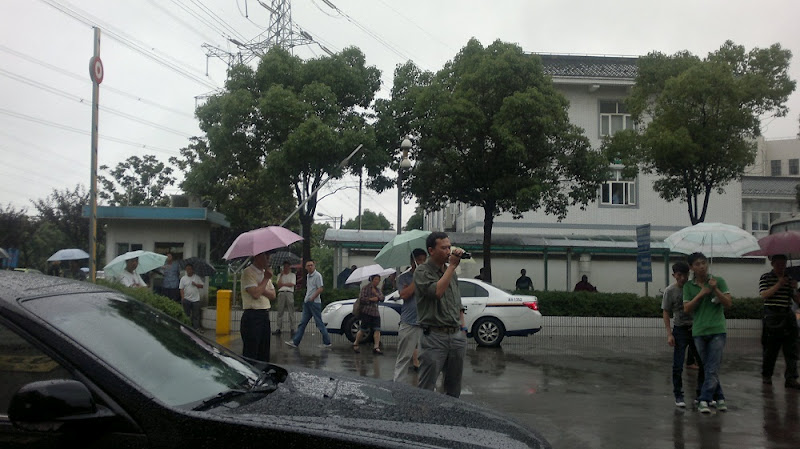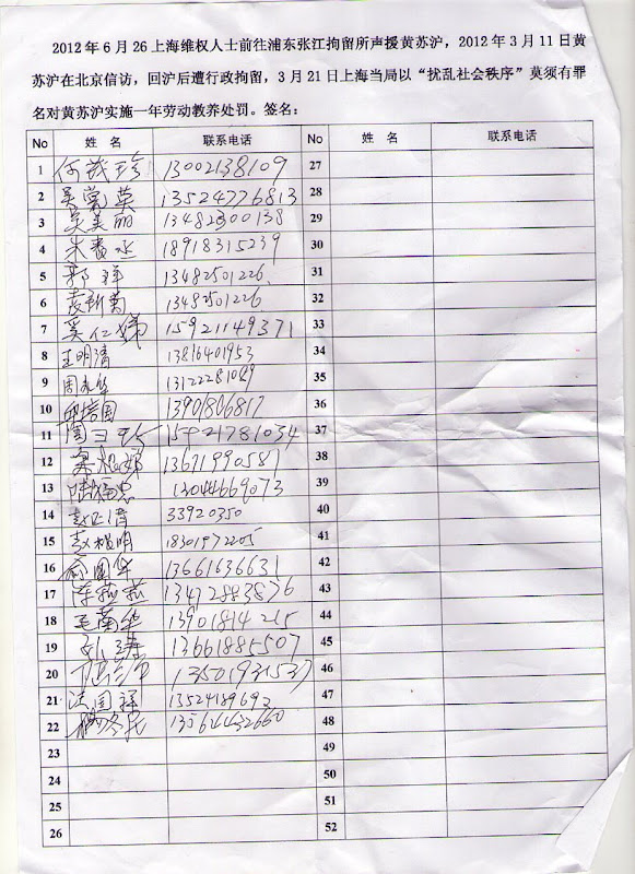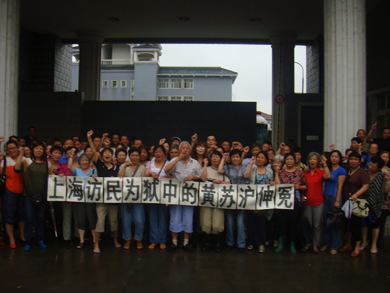 26日下午13时30分,黄苏沪被劳教一案在位于华益路355号的上海市浦东新区拘留所开庭, 同样遭受暴力强拆的近百民访民冒着大雨前往声援,大家在拘留所门口打出“上海访民为狱中的黄苏沪伸冤”的横幅,声援黄苏沪,控诉和抗议上海市政府操纵司法打压迫害访民的罪行。10多名武警上前阻止,周围布满虎视眈眈的便衣,几名便衣拿着录像机对着抗议的人群跟踪拍照。上访民众群情激昂,拉着横幅聚在一起,对着便衣的录像机一遍遍地很有节奏的齐声振臂高呼“黄苏沪冤枉!”,“黄苏沪冤枉!”……