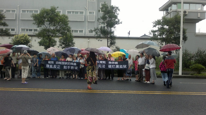 (维权网信息员方芳报道)6月26日下午,上海暴力强拆受害人黄苏沪因上访遭受打击迫害被劳教而提起行政诉讼一案,在浦东拘留所开庭,近百民访民冒着大雨前往声援。大家打出“上海访民为狱中的黄苏沪伸冤”的横幅,齐声高呼“黄苏沪冤枉!”,声援黄苏沪,控诉上海政府操纵司法,打击迫害上访群众的罪行。