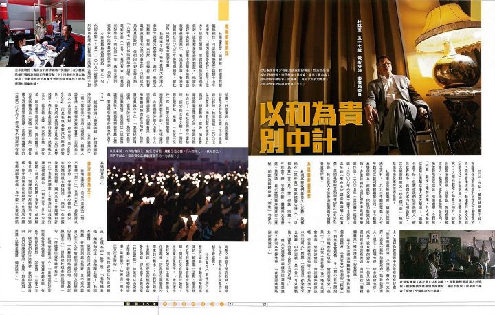 杜琪峯跟我們談後九七形勢,就像他在《黑社會》電影裡警告港人,「以和為貴」並不是上策。他說,回歸十五年社會不穩,爭拗不斷,關鍵是未有普選。他強調,自己認同循序漸進民主進程,卻認為回歸後連「漸進」也算不上。他認為普選對中央政府也有好處:「如果普選行到,矛頭就不會在中央政府,而是(屆時特區政府)執政的那班人。現在,西環也好,中央政府也好,成為了被攻擊的對象。」他又強調,普選特首必須是真普選,而不是從「爛橙爛蘋果」裡二擇其一的假選舉。