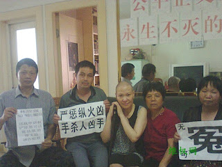 最后,4冤民手举诉状标语和范燕琼一起在“公平正义是永生不灭的圣火”,“言论无罪自由万岁”下留影。