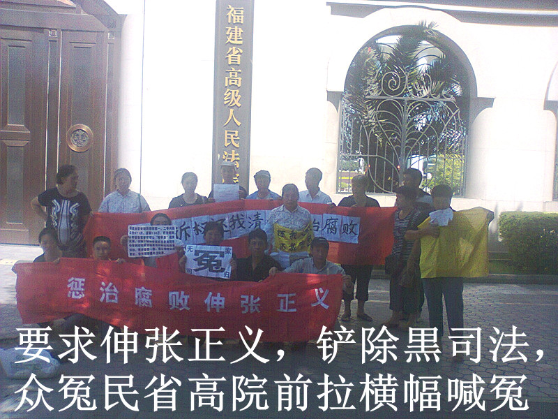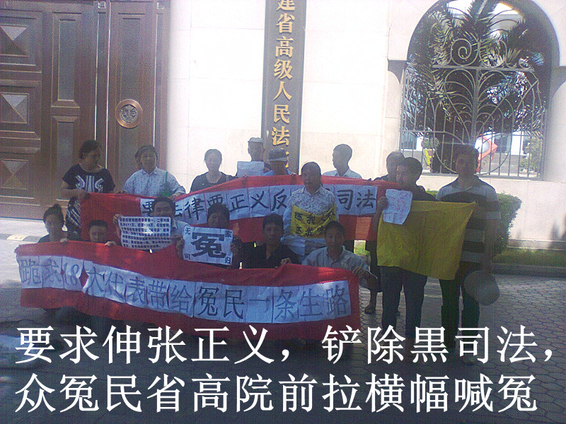 (维权网信息员任长霞报道)今天(7月1日)是中共建党节,适逢星期天,又是福州众冤民集体鸣冤的日子。林兰英、林祥官、卓道明、熊凤莲老公、陈依香、刘玉钗、罗丽华、吴京、高云景、陈美钦、魏英、卓友桂、林应强、林炳兴、吴抃等19位福州冤民集体到福建省高级人民法院前拉横幅喊冤,要求伸张正义铲除黒恶司法。