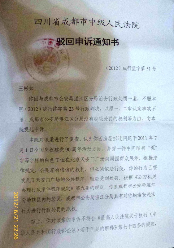 (维权网信息员周伟报道)成都市温江区访民王彬如,拿到成都市中级法院的驳回通知书,驳回了她因去北京上访,内穿冤衣到天安门被截访回来,后被拘留9天的行政申诉。