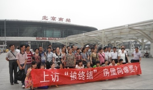 (维权网信息员张成报道)因长沙市众多强制拆迁受害访民的上访被信访局全部终结,多位访民前往北京上访,在北京南站拉出横幅:“我们的房子找谁要!”。6月30日凌晨,多位长沙访民被送进久敬庄,随即被强制遣返回长沙。当晚9点,访民回到长沙后在610法制培训基地门口,各辖区负责维稳人员分别把访民们带走。