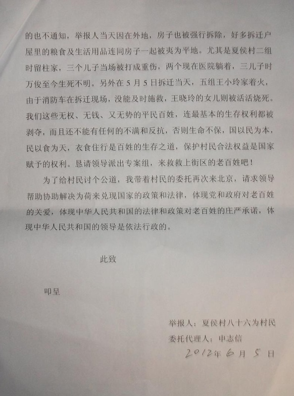 (维权网信息员关小令报道)家住河南省郑州市上街区夏侯村访民代表申志信(手机15824820898),受联名村民委托向本网信息员转送书面材料揭露,中央建设部下文清理和严禁建小产权房文件,但郑州市上街区夏侯村仍然动用警力强占强拆建小产权房,致死人命后封锁消息。