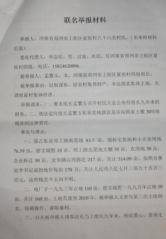 郑州市上街区夏侯村86位村民联名检举控告地方政府违背中央政令,占完村民全部耕地后,又暴力拆迁村民住建小产权房谋暴利,且偷漏数亿国家税收,给百姓造成巨大经济损失和精神伤害,由此制造的社会矛盾,将留下无穷后患。