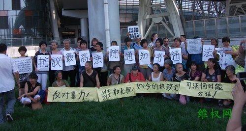 (维权网信息员关小令报道)7月2日和3日连续两天, 来自全国各地在京访民, 再一次前往中央政法委和北京南站交通要道举行示威抗议活动, 抗议公、检、法队伍腐败, 制造冤假错案, 一错到底, 既使申诉到最高法院, 也仍拒不纠正, 包庇地方法院作恶。