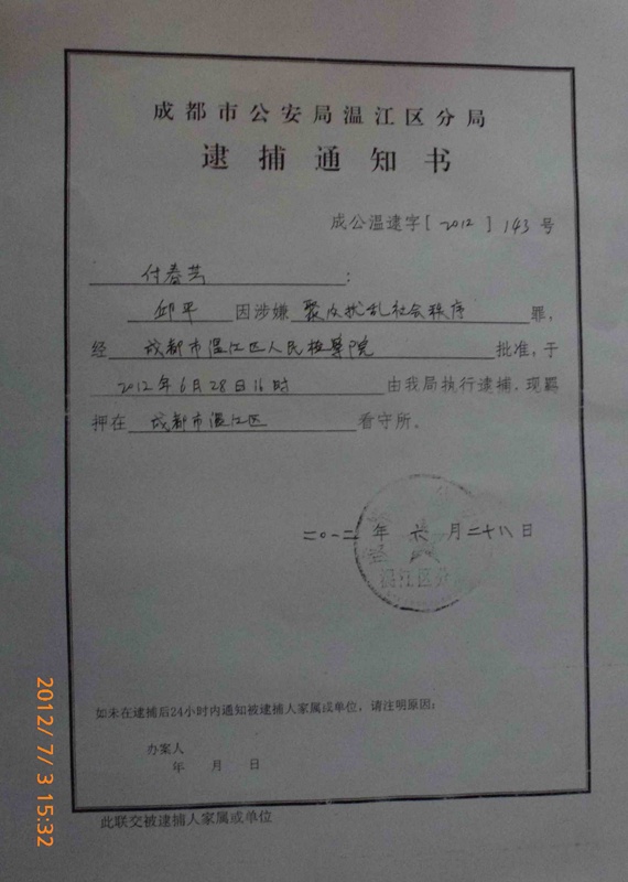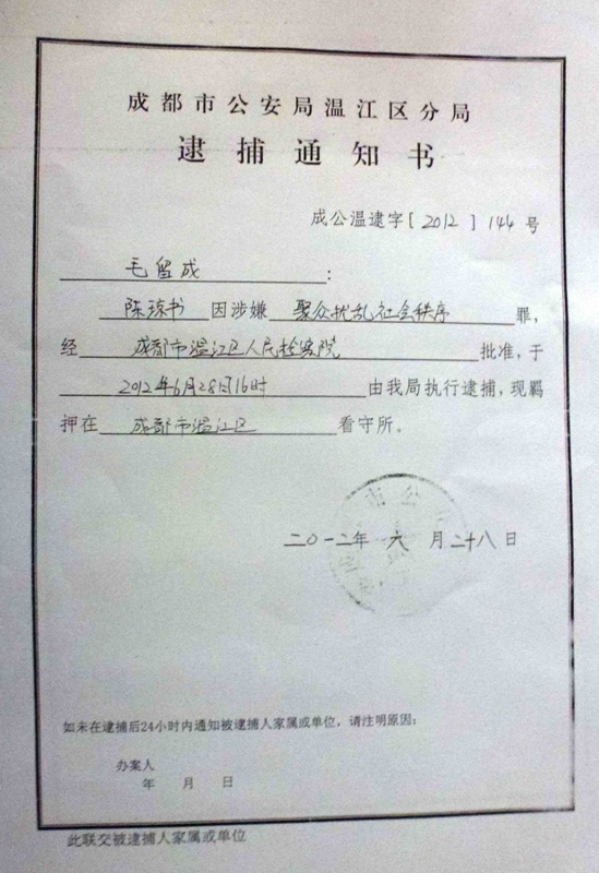 其中邱云贵、秦中国在刑拘最长期限届满时,被以“取保候审”释放,由于陈琼书、邱平坚持自己无罪,6月28日被温江检察院以“聚众扰乱社会秩序罪”批准逮捕。