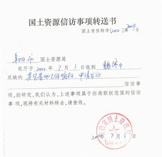 (维权网信息员周维林报道)安徽省界首市访民魏寒忠于2012年7月3日就宅基地土地证一事再一次赴安徽省国土资源厅上访,又再次获得国土资源厅的《信访事项转送书》,信访事项就这样一次次的转送,界首市负责办理土地证的国土资源局则一次次的拖着不办,从1999年拖延至今不办。其中有很深的隐情,一旦浮出水面,真相大白,则不啻是一颗炸弹,揭开界首市公安系统的黑幕,其影响巨大。