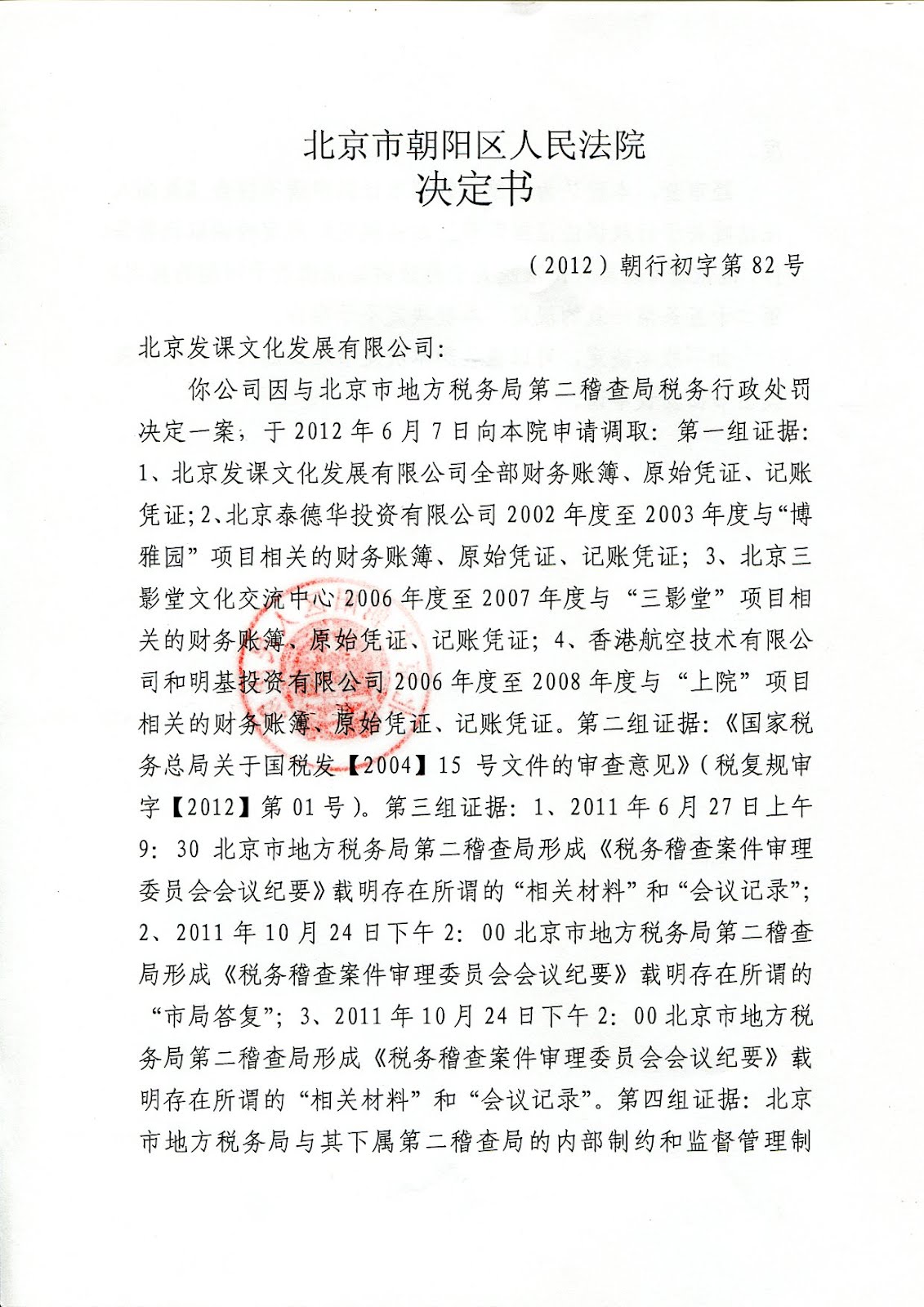 2012年7月5日,发课公司收到《朝阳区人民法院决定书》,不予准许发课公司申请法院调取北京发课公司被扣押的全部财务帐簿资料和泰德华、三影堂、航空技术有限公司、明基投资公司的相关帐簿资料的申请。