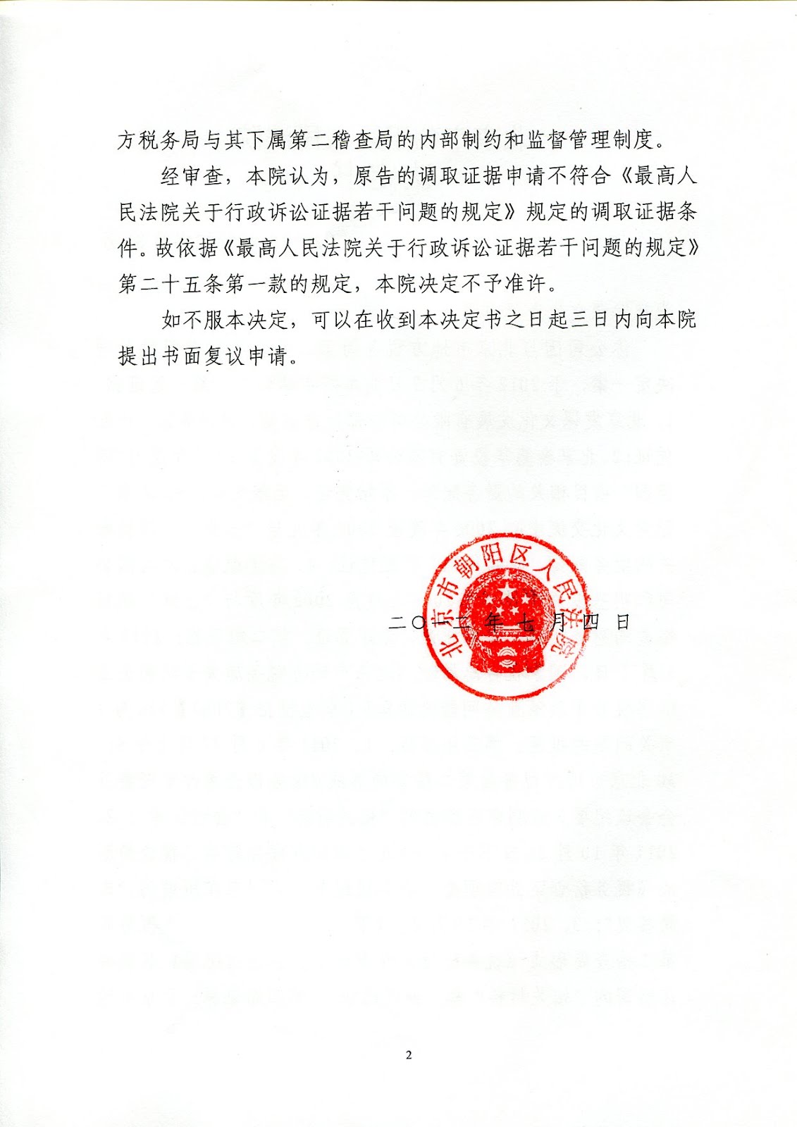 你公司因与北京市地方税务局第二稽查局税务行政处理决定一案;于2012年6月7日向本院申请调取:第一组证据:1、北京发课文化发展有限公司全部财务账簿、原始凭证、记账凭证;2、北京泰德华投资有限公司2002年度至2003年度与“博雅园”项目相关的财务账簿、原始凭证、记账凭证;3、北京三影堂文化交流中心2006年度至2007年度与“三影堂”项目相关的财务账簿、原始凭证、记账凭证;4、香港航空技术有限公司和明基投资有限公司2006年度至2008年度与“上院”项目相关的财务账簿、原始凭证、记账凭证;第二组证据:2012年3月6日,国家税务总局就《北京市地方税务局关于明确企业所得税若干政策业务问题的通知》(京地税企【2002】526号)有关问题的批复。第三组证据:1、2011年6月27日上午9:30北京市地方税务局第二稽查局形成《税务稽查案件审理委员会会议纪要》载明存在所谓的“相关材料”和“会议记录”;2、2011年10月24日下午2:00北京市地方税务局第二稽查局形成《税务稽查案件审理委员会会议纪要》载明存在所谓的“市局答复”;3、 2011年10月24日下午2:00北京市地方税务局第二稽查局形成《税务稽查案件审理委员会会议纪要》载明存在所谓的“相关材料”和“会议记录”。第四组证据:北京市地方税务局与其下属第二稽查局的内部制约和监督管理制度。 经审查,本院认为,原告的调取证据申请不符合《最高人民法院关于行政诉讼证据若干问题的规定》规定的调取证据条件。故依据《最高人民法院关于行政诉讼证据若干问题的规定》第二十五条第一款的规定,本院决定不予准许。 如不服本决定,可以在收到本决定书之日起三日内向本院提出书面复议申请。