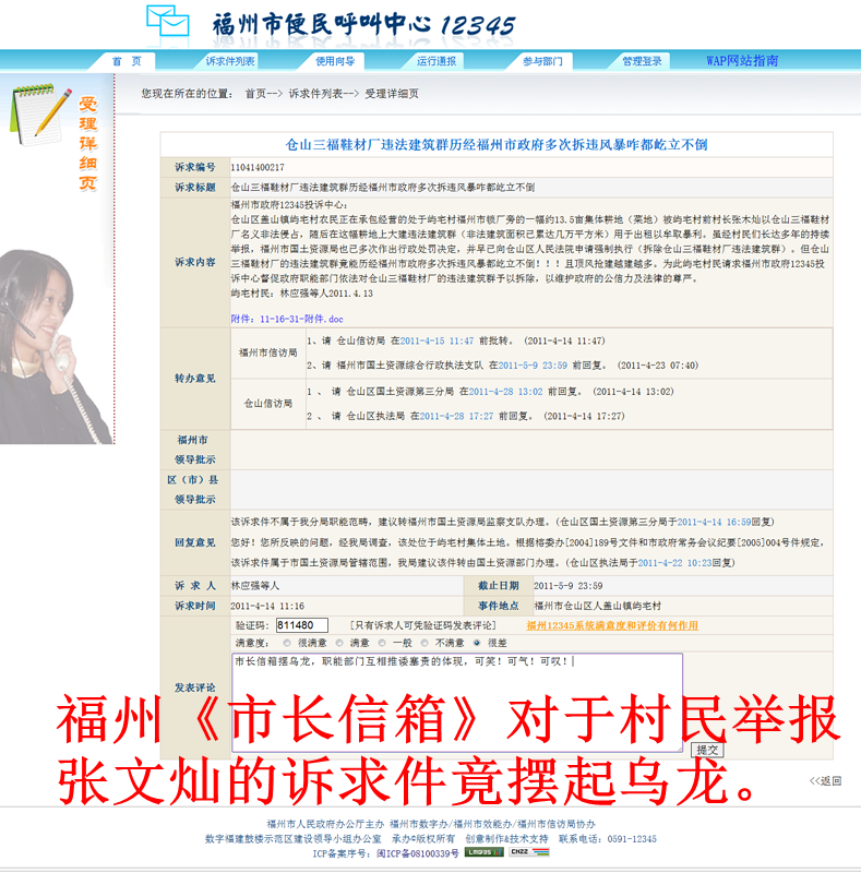一直以来腐败村长张文灿的违法气焰极其嚣张,曾经公开对80高龄的老冤民林东发(冤民林应强父亲)大放厥词:“不管你儿子(林应强)怎么告都没用,最后得好处的是贪官!!!”。张文灿并非无的放矢,虽处于林应强等村民的不断举报之下,竟能历经福州市数次拆违风暴,其违法建筑群就是能屹立不倒!而且涉嫌犯罪也能逍遥法外!!!