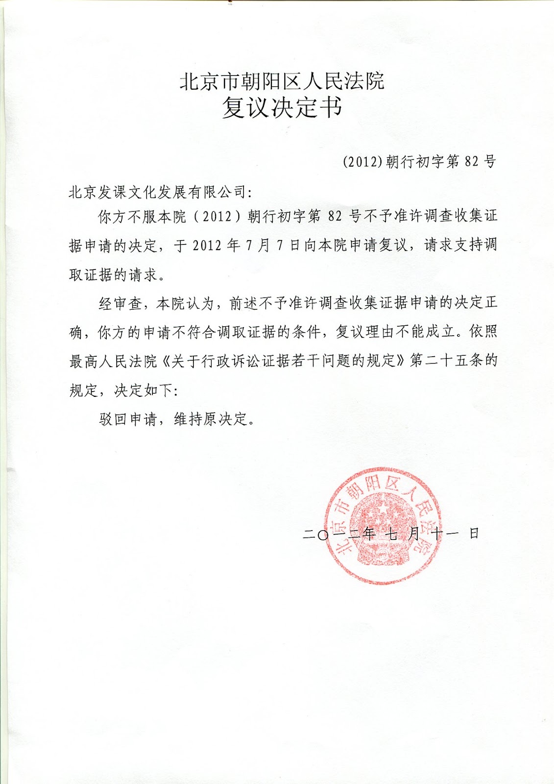 艾未自由 | 朝阳法院驳回发课公司调取证据的复议申请7月11日 2012年7月12日 原文 北京市朝阳区人民法院复议决定书81号(如图) 北京市朝阳区人民法院复议决定书82号(如图) 本文由自动聚合程序取自网络,内容和观点不代表数字时代立场 定期获得翻墙信息?请电邮订阅数字时代 所在分类:网事纷呈标签:网刊推荐,自由,公民媒体 相关文章 城市的地得|2025年我明白的事 盘点六条|反对“封存吸毒记录”跟追求正义没一毛钱关系 【404文库】旧闻评论|铁路正能量惨遭羞辱 张3丰|砸窗的勇气,需要练习 【CDT报告汇】哨兵实验室:中国当局利用私营网安公司进行敏感词审查(外二篇)