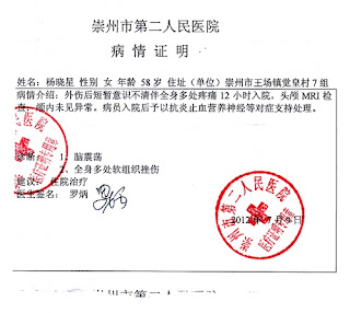 杨晓星接着说:“九点钟,我到乡政府找到孙书记:把我的经过向孙书记说一遍,孙书记说:调查后,该赔理就赔理,打伤就医。后来,我第二次又到派出所报案,照了一张照片,中午周所长给我送了小碗饭菜,吃后几分钟接连吐了几次,派出所有照片作证,当时我头痛、头晕、头昏、呕心、呕吐,实在受不了,周所长说:先去医院治病下来再说。乡政府派了一辆863车跟踪我们,我们走到哪他们就到哪,我们怕他们再次陷害我。第三次到了派出所报案,叶涛警官去问他们,他们回答说:害怕我又去上访,我叫政府他们的车送我到医院看病,他们就叫我到王场医院去看病,我怕他们再陷害我,我直到崇州医院,他们一直跟踪到崇州红十字医院,他们一直在外面等,见到我住院才走,医生诊断我是脑震荡,并且我一只耳朵听不见,左手不能动。我现在住在二楼神经科四病室住院,住院后政府无人过问,我身无半文,全靠借钱医治,现在四处无法再借“。