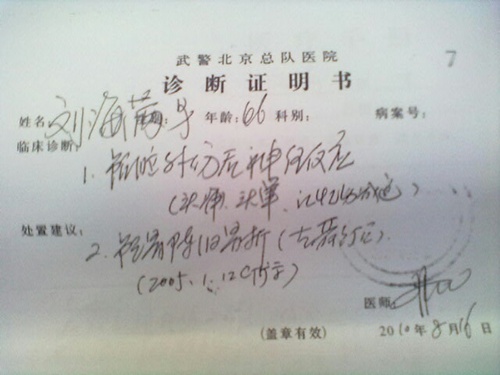 刘海满身患脑梗、脑血栓、心脏病、高血压等疾病,几近生活不能自理(有秦皇岛第一医院与北京武警总队医院病历本与诊断书),公安机关与劳教所双方都知道刘海满是一位这样病人的前提下,在没有对病人做任何体检的情况下,将他关押在秦皇岛市海港区劳教所。