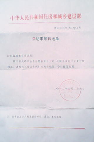 12日早上陈茜下楼时发现有2人看守在门口,陈茜没有理会,出门去了成都市信访局,并拿到了信访回执单。回家后就出现了文章开头的一幕。