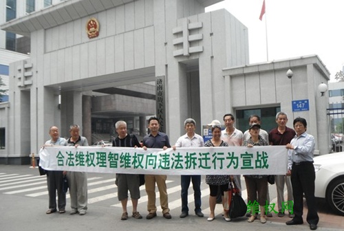 有近200名拆迁户和维权人士赶来旁听和声援,历下区法院把旁听者挡法院大门外,不准他们进入法庭旁听,激起了众旁听者的愤怒。他们堵住法院大门,法院的车辆无法进出。历下区法院只得将准予旁听者进入法庭。该法庭旁听区的席位只能坐20来人,其余的旁听者只能站着,被告席后面站满了旁听者,法官忧心忡忡,怕旁听者对被告动粗,于是,叫来法警将旁听者与被告隔离。但旁听者太多,法庭窄小,难以隔开;原告席背后也站满了旁听者。由于站着旁听的人众多,审判庭的大门敞开,法庭内外依然挤满了旁听者,甚至审判庭的走廊也挤得满满的。滑稽的是,部分原告也只能站着开庭;第三人坐到了旁听席上。如此别开生面的庭审场景,如同赶集。任军法官说,今天是他的生日。