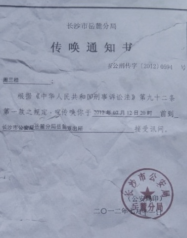 7月12日上午,派出所向周三桂下达了传唤通知书,周三桂15点左右到达岳麓派出所,晚6点才到家。谢所所威胁说,时间很急,要周三桂和拆迁指挥部协商,协商成了就算了,在晚上两点之前没搞好,就把谢燕送进监狱。下一个就是你周三桂,按“伪造公文罪”处罚。